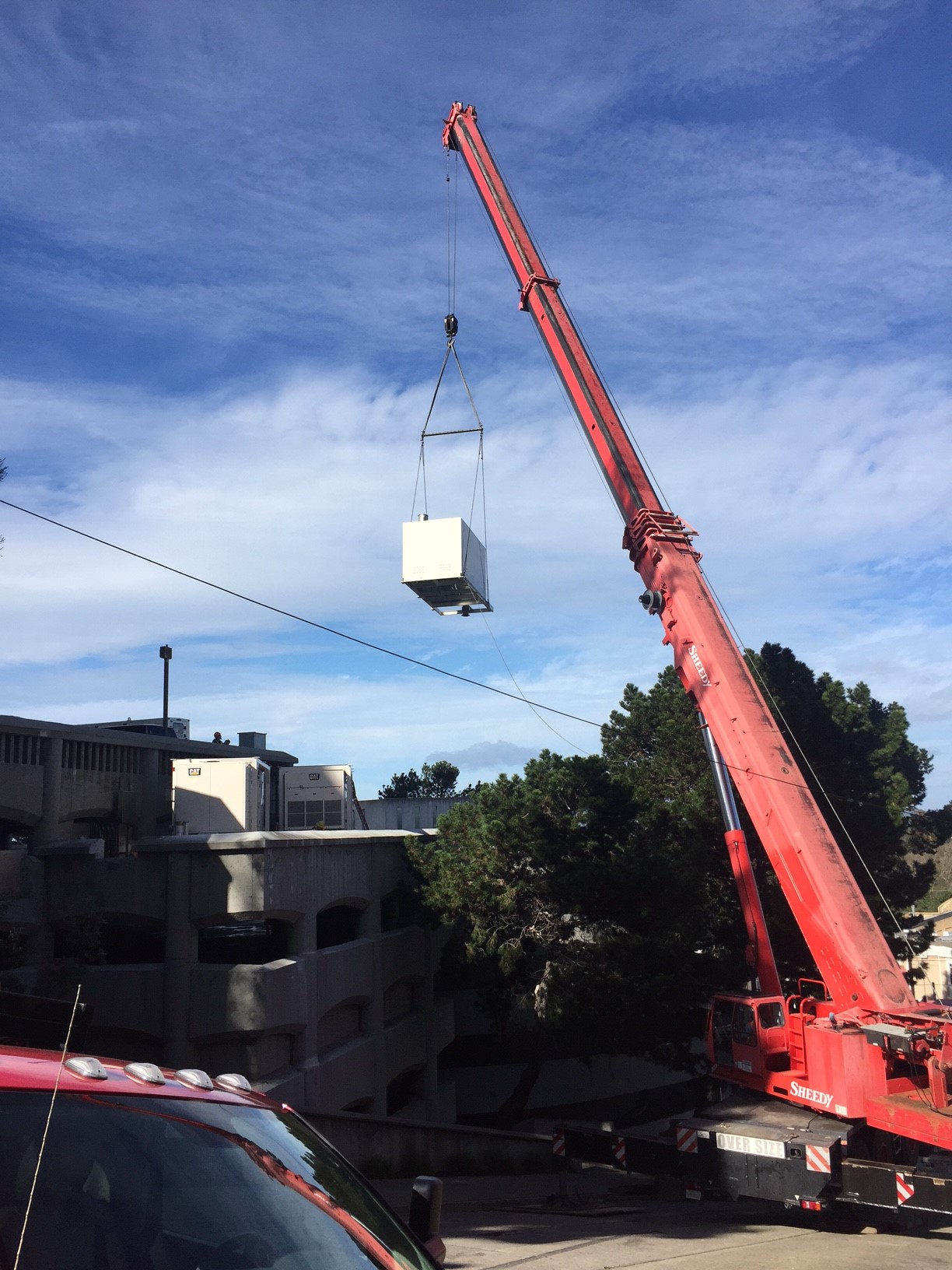 Project consists of installing new parallel 600 kw generators with paralleling switch gear and distribution located on the roof of the parking garage. Coordination was required to shutdown the street in order to hoist the generator on to the roof.